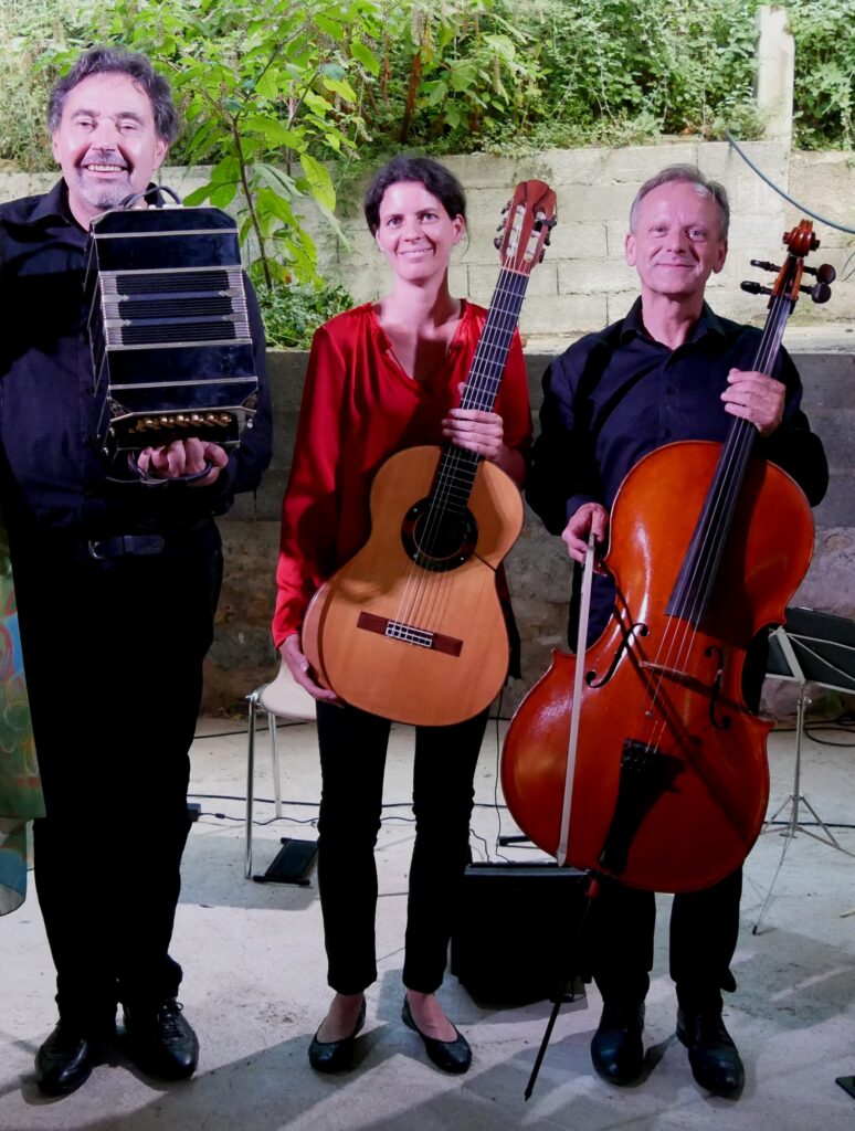 Nathalie MENGUAL guitare, François RAGOT violoncelle, Laurent CLIGNY bandonéon et arrangements.